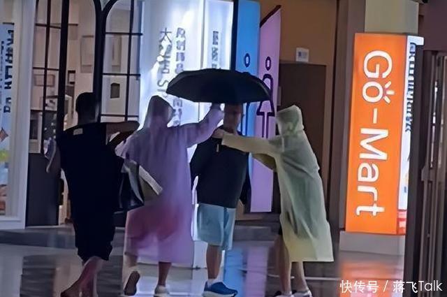 更扎眼的,是身后三把伞——两人抬着大伞,帮他遮得严严实实,还有一人跟着打理细节,生怕有一滴雨落在他身上。 把伞的人,不是临时钟点工。
