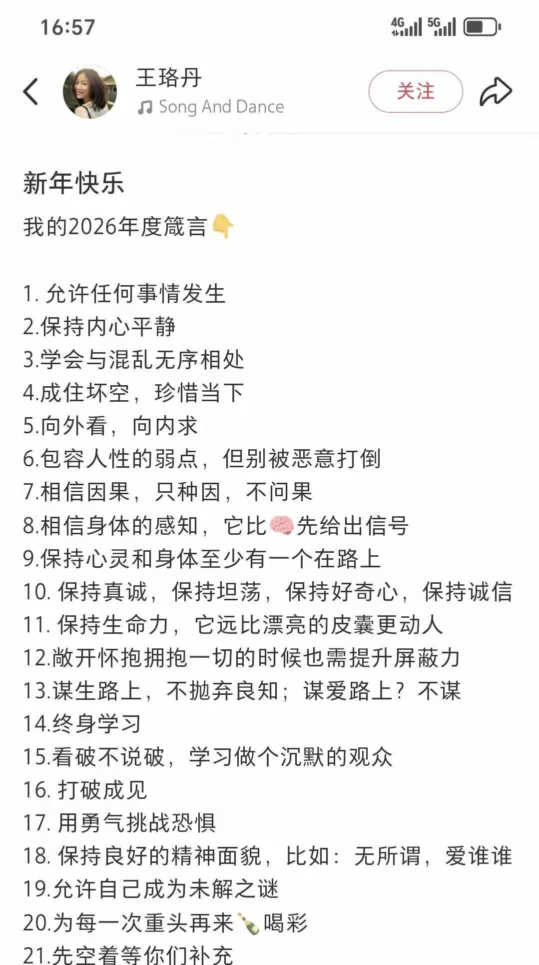 她没停在这儿,紧接着贴出26条自己写的年度感悟。不是鸡汤,不是转发来的名人名言,更不像那种包装过的“明星语录”,倒像是深夜独处时写在备忘录里的碎碎念,翻出来顺手发了。一条条往下读,有些甚至带点硌人:“别把情绪当真相”“越早接受没人真正理解你,反而轻松了”“允许自己废一阵子,但别赖着不走”。这些话听着不甜,可嚼着有味。